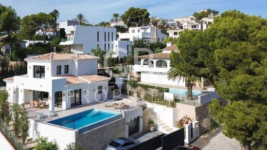 Nouvelle maison de luxe offrant une vue sur la mer et une belle vue ouverte sur Moraira, idéalement située dans une urbanisation tranquille à seulement 2,5 km des plages et du centre.