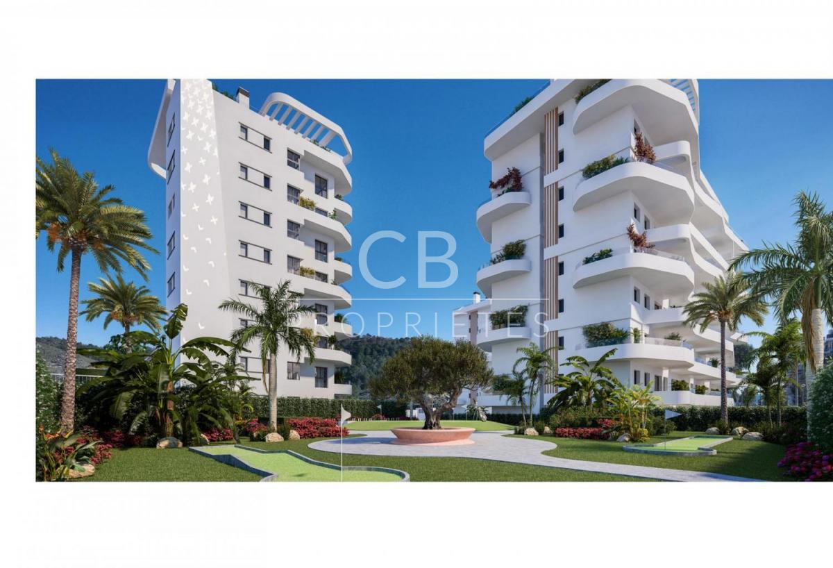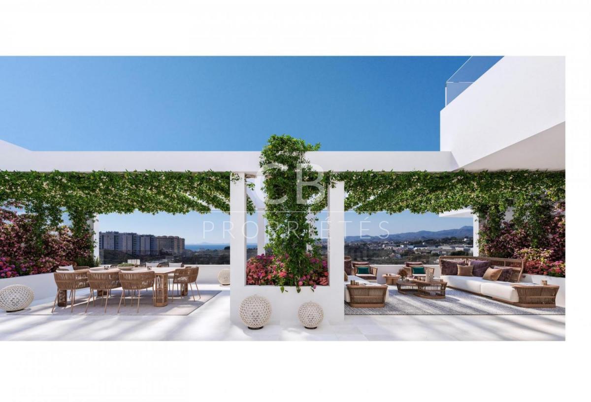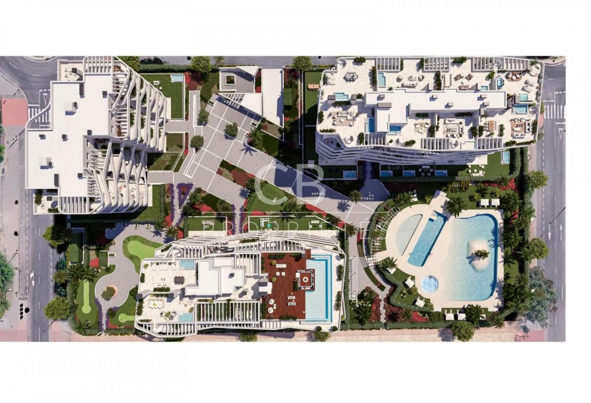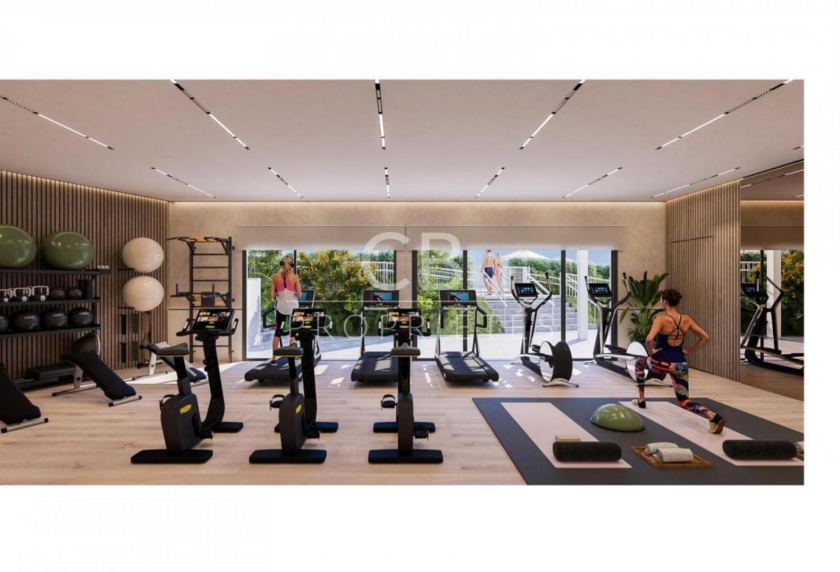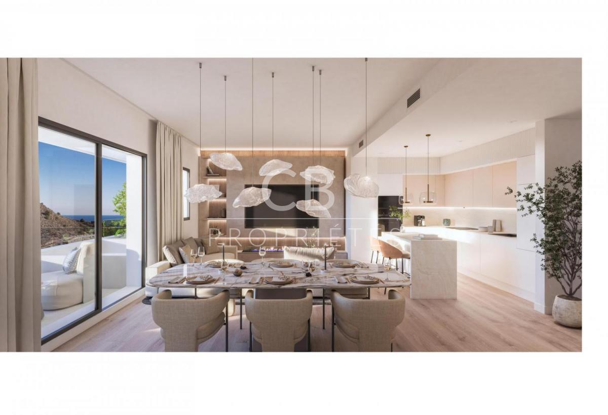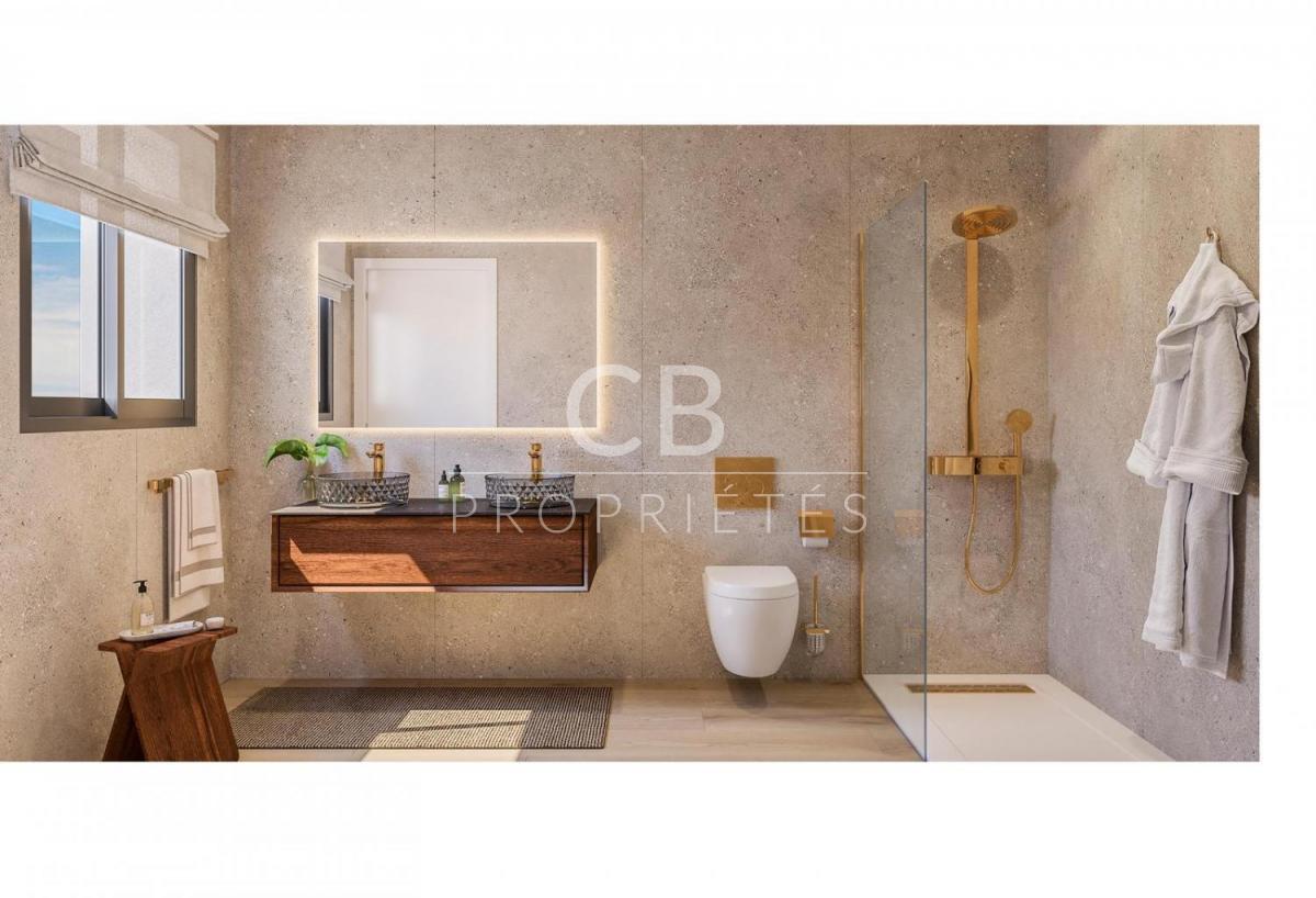 Les intérieurs se caractérisent par des finitions soignées et lumineuses. Le sol en SPC Linkfloor de qualité supérieure assure une sensation de continuité et de confort dans toutes les pièces, tandis que les menuiseries extérieures en PVC à rupture de pont thermique offrent une excellente isolation acoustique et thermique. Les cuisines, à la fois modernes et fonctionnelles, sont entièrement équipées avec des appareils électroménagers de grandes marques comme Bosch ou Samsung. Les plans de travail en Silestone ou matériaux similaires allient esthétique et durabilité, créant un espace convivial et raffiné pour cuisiner et partager. Les salles de bains combinent design et bien-être : sanitaires suspendus, miroirs rétroéclairés et douches à effet pluie s’accompagnent d’un chauffage au sol pour un confort optimal, même en hiver. Les chambres disposent d’armoires encastrées parfaitement intégrées, offrant un espace de rangement généreux et une harmonie avec le reste de la décoration intérieure. Les terrasses et solariums, véritables extensions de l’espace de vie, bénéficient de revêtements antidérapants et d’une finition haut de gamme. Chaque détail y est pensé pour profiter pleinement du climat et des vues environnantes : coin détente, espaces repas, ou encore solarium privatif pour certains logements.