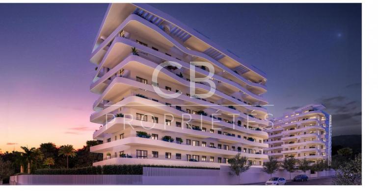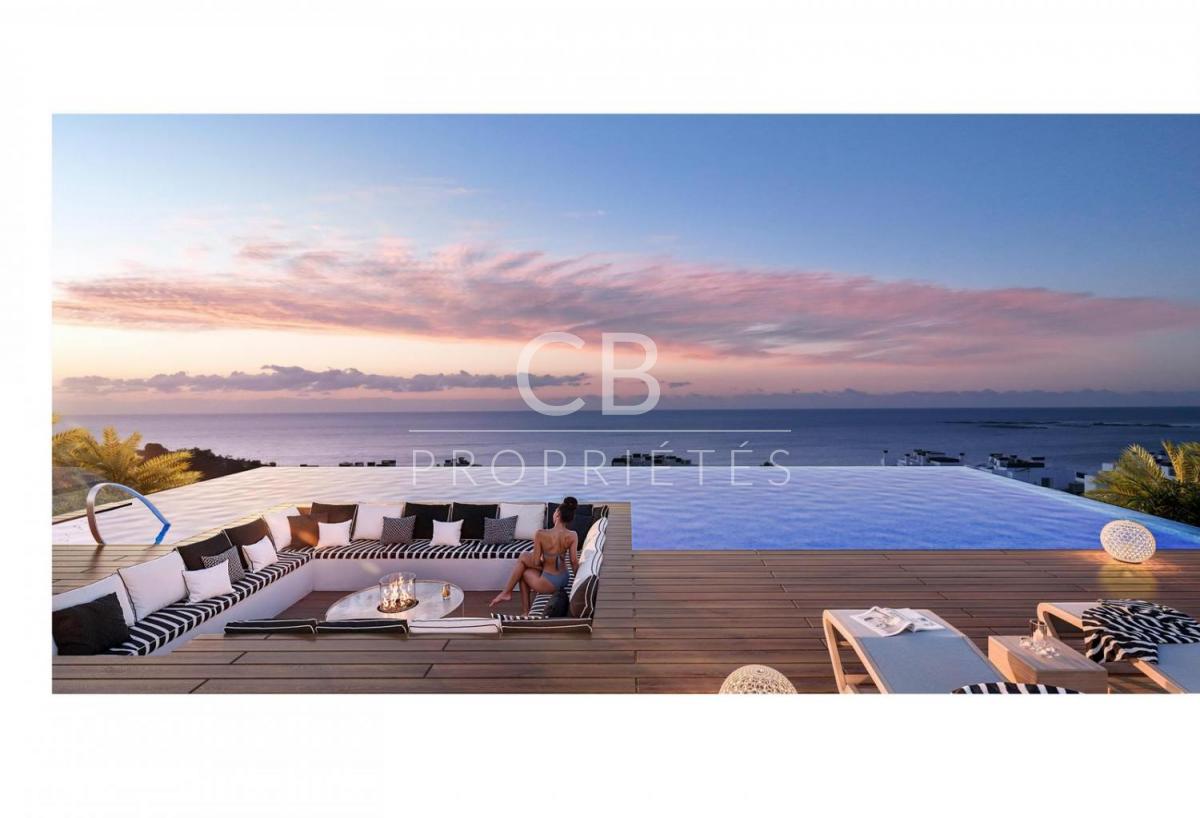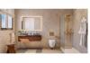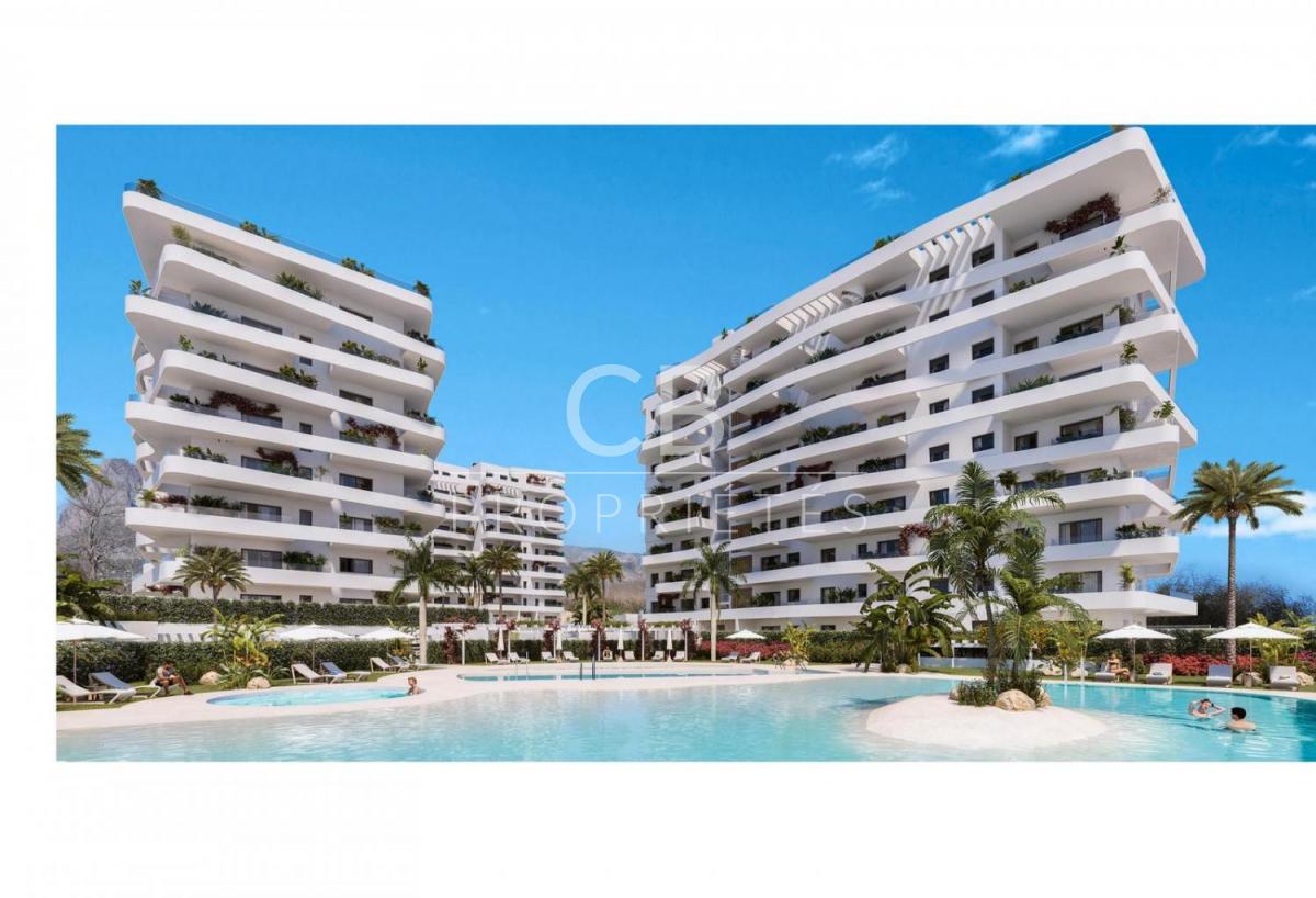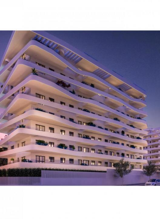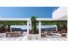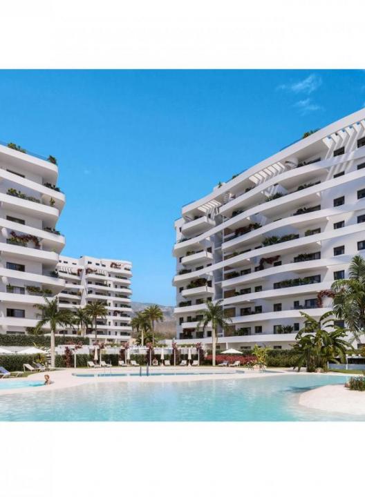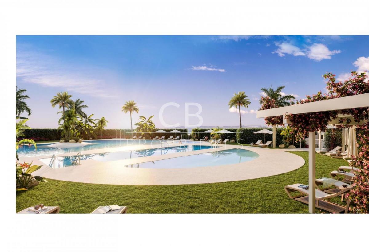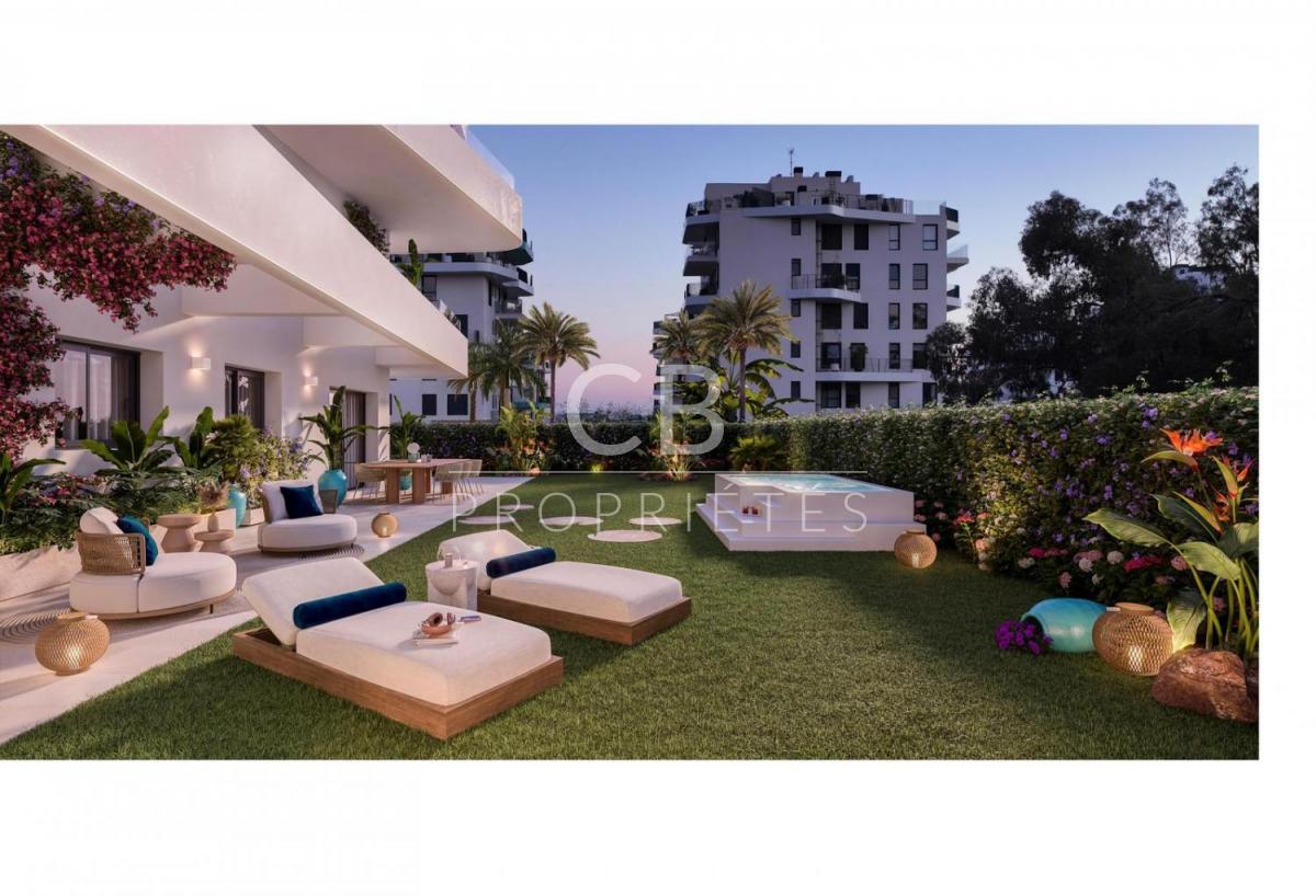 Les intérieurs se caractérisent par des finitions soignées et lumineuses. Le sol en SPC Linkfloor de qualité supérieure assure une sensation de continuité et de confort dans toutes les pièces, tandis que les menuiseries extérieures en PVC à rupture de pont thermique offrent une excellente isolation acoustique et thermique. Les cuisines, à la fois modernes et fonctionnelles, sont entièrement équipées avec des appareils électroménagers de grandes marques comme Bosch ou Samsung. Les plans de travail en Silestone ou matériaux similaires allient esthétique et durabilité, créant un espace convivial et raffiné pour cuisiner et partager. Les salles de bains combinent design et bien-être : sanitaires suspendus, miroirs rétroéclairés et douches à effet pluie s’accompagnent d’un chauffage au sol pour un confort optimal, même en hiver. Les chambres disposent d’armoires encastrées parfaitement intégrées, offrant un espace de rangement généreux et une harmonie avec le reste de la décoration intérieure. Les terrasses et solariums, véritables extensions de l’espace de vie, bénéficient de revêtements antidérapants et d’une finition haut de gamme. Chaque détail y est pensé pour profiter pleinement du climat et des vues environnantes : coin détente, espaces repas, ou encore solarium privatif pour certains logements.